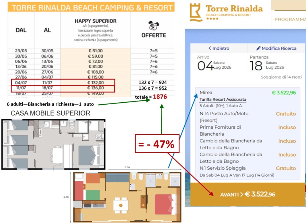> a noi Casa mobile Superior 6 posti 2 bagni dal 4 al 18 Luglio 2026 Torre Rinalda Village 14 notti € 1.876 -